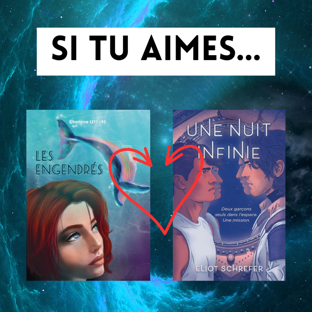 Je vous présente ces deux-là ensemble surtout pour l’idée de commencer à lire de la SF avec. Je pense qu’il est clair que « Une nuit infinie » (chez Rivka) est une romance-sf, ce qui n’est pas du tout le cas de « Les Engendrés », mais on retrouve dans les deux cas ce côté huis clos addictif, ce petit côté « enquête » à essayer de comprendre des évènements/éléments étonnant jusqu’à la révélation.